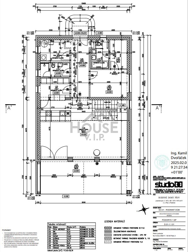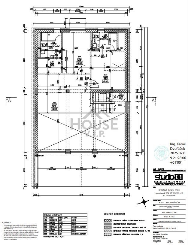 Nabízíme k prodeji moderní rodinný dům na klíč 4+kk, o užitné ploše 194 m2, který bude realizován na slunném pozemku o výměře 1 000 m2, v klidné části obce Podbořany s krásným výhledem do zeleně. Projekt je připravován ve vysokém standardu přímo vlastníkem pozemku, s důrazem na kvalitu použitých materiálů, energetickou úspornost a komfortní bydlení. Schválení stavebního povolení očekáváme koncem roku 2025. Výstavba a cena: Cena zahrnuje pozemek a realizaci hrubé stavby (základy, nosné konstrukce, střecha, zateplení, okna, dveře, schodiště). Za příplatek je možné dokončit dům přesně dle vizualizace a požadavků kupujícího. Na prodej je také sousední pozemek včetně realizace o stejné výměře 1 000 m2 (viz koordinační výkres). Je také možné koupit pozemek ihned s hotovým projektem za 2.49 mln. s možností samostatné realizace. Financování stavby je možné rozdělit na jednotlivé etapy, takže celou částku nemusíte platit najednou. Zastavěná plocha: 178,57 m2. Podlahová plocha: 194,25 m2. • 1. NP: 117,42 m2 + terasa 35,79 m2. • 2. NP: 76,83 m2. Výška stavby: 8,86 m. Konstrukce: nosné stěny z dutinových keramických tvárnic. Strop nad 1. NP: železobetonový monolit (tl. 250 mm). Vytápění: tepelné čerpadlo + krbová vložka. Další technologie: fotovoltaika, klimatické zatížení řešeno v projektu. Přípojka vody: ze stávající studny. Kanalizace: domovní ČOV. Dispozice 1. NP (117,42 m2): Technická místnost (6,81 m2), WC (5,22 m2), spíž (7,54 m2), vstupní hala (13,63 m2), ložnice (12,37 m2), šatna (5,73 m2), druhá šatna (5,91 m2), obývací pokoj s kuchyňským koutem (60,21 m2) a terasa (35,79 m2). Dispozice 2. NP (76,83 m2): Schodiště (8,47 m2), galerie (23,82 m2), ložnice (14,92 m2), koupelna (5,65 m2), druhá ložnice (13,67 m2), šatna (4,09 m2) a koupelna (6,21 m2). Lokalita: Nemovitost se nachází v tiché části obce, pouhých 350 m od autobusové zastávky směr Žatec. Podbořany nabízejí plnou občanskou vybavenost, dobrou dostupnost do větších měst a krásné okolí ideální pro rodinné bydlení. Energetická náročnost: Budoucí PENB bude odpovídat hodnotám nízkoenergetického až pasivního domu třídy "A", což zaručuje nízké provozní náklady. Pro více informací o rodinném domě a možnostech individuálních úprav nás kontaktujte.