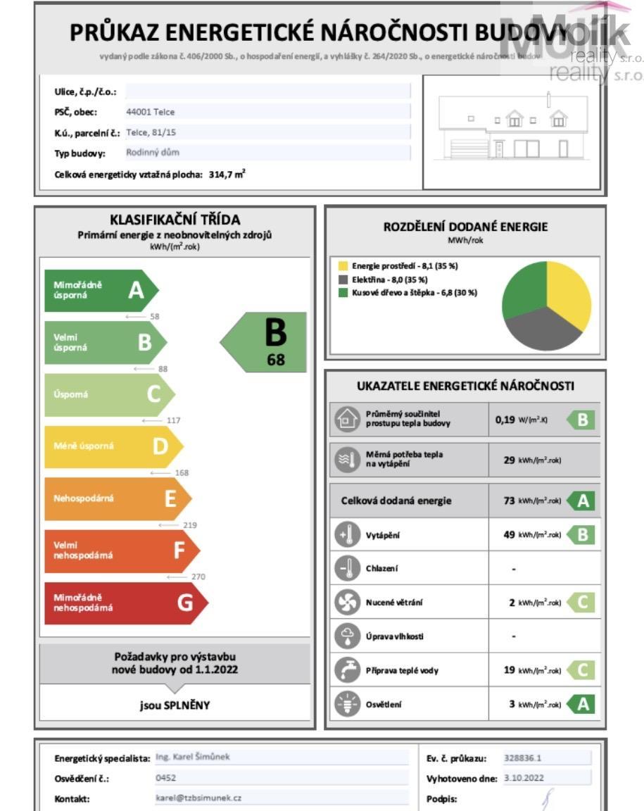 Nabízíme k prodeji rodinný dům o velikosti 8 + kk se dvěma nadzemními podlažími s garáží. Ideální dům pro rodiny, které hledají moderní a pohodlné bydlení v klidném prostředí. Promyšlená dispozice nabízí dostatek prostoru pro všechny členy rodiny. Díky tepelnému čerpadlu vzduch-voda (Power World PW040 s Wi-Fi ovládáním) je bydlení energeticky úsporné a komfortní po celý rok. Telce jsou klidná obec s výbornou dostupností do Prahy (cca 30 minut autem) a vlakovým spojením do Kralup nad Vltavou. V obci je základní občanská vybavenost škola, pošta, obchod, sportovní a volnočasové možnosti ideální místo pro rodiny, které hledají kombinaci klidu a komfortu. Seriózní jednání, možná dohoda. Možno financovat jinou nemovitostí na protiúčet (dům, byt, zahrada, garáž). Více informací u uvedeného makléře 7 dní v týdnu.