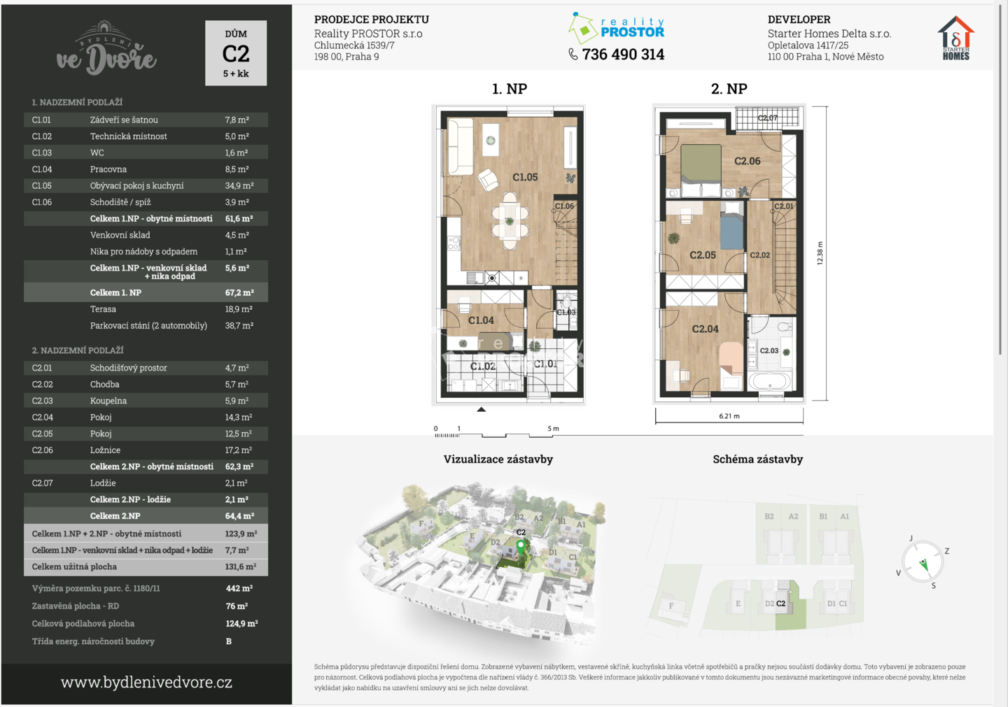Jedná se o dvoupodlažní, moderní rodinný dům (dvojdům) 5+kk, 131,7m2, s plochou střechou, který je postaven na pozemku o rozloze 406 m2, v rezidenční čtvrti, v centru města Roudnice nad Labem. Dispoziční členění rodinného domu je ideálních 5 pokojů + kuchyňský kout. Na JZ sousedí rodinný dům se zrcadlově převráceným domem D2. Dům C2 je umístěn v samém středu lokality a sousedí se dvěma dalšími rodinnými domy, takže je zajištěn minimální vliv okolních domů. Veškerou energii domu zajistí teplené čerpadlo, které se v současné době vysokých cen energií jeví jako naprosto nejhospodárnější způsob vytápění a ohřevu vody. Rodinný dům je zateplený izolantem tl. 20 cm, což zajistí minimální tepelné ztráty, stejně tak jako výplně otvorů, kde je použito energeticky nejvýhodnější trojsklo. Velkou výhodou tohoto domu je venkovní terasa, která je orientována na JZ stranu, takže se sluníčkem můžete počítat až do samotného konce dne. V přední části pozemku je umístěn velice praktický, zastřešený úložný prostor - sklad s navazujícím nezastřešeným výklenkem určeným pro umístění nádoby na komunální odpad. Samozřejmostí je vybavení každého domu domácím videotelefonem. K rodinnému domu si lze objednat a přikoupit různé balíčky nadstandardních prvků, jako je oplocení v zahradní části, zastřešená pergola na terase, venkovní žaluzie, kompletní zastřešení parkovacího stání, klimatizaci, fotovoltaickou elektrárnu na střechu a podobně. Domy se nacházejí v těsné blízkosti centra města, s veškerou občanskou vybaveností, jako je základní škola, školka, lékaři, obchody a nedaleko i vlakové a autobusové spojení na Prahu. Po dálnici D8, 20 minut Letňany.